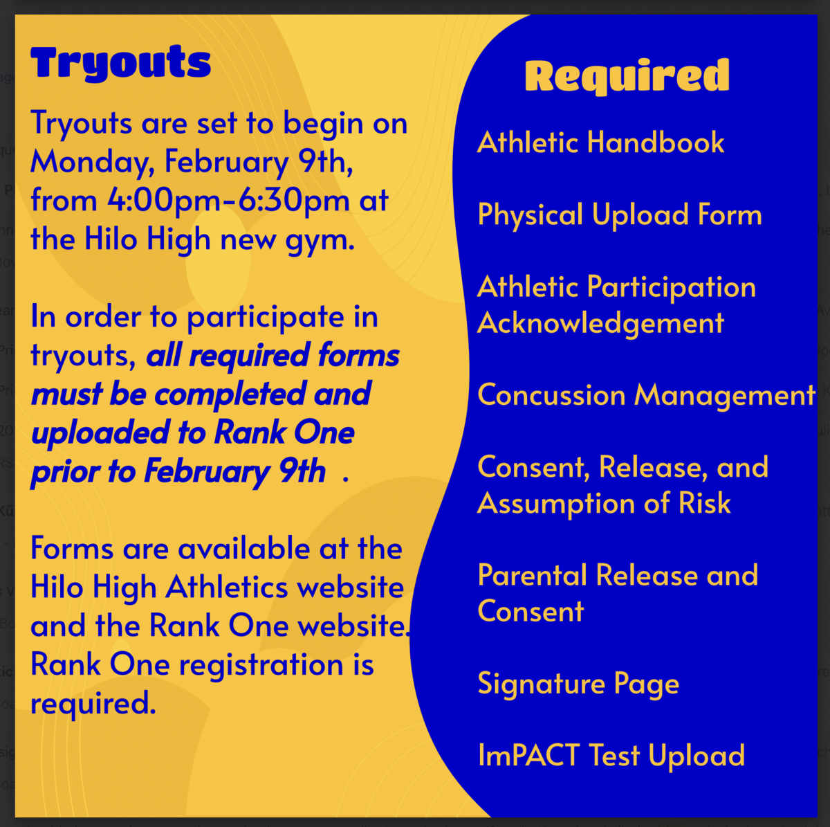 (2/25-3/4) Students interested in taking Driver Education should sign up as soon as possible. The next class begins right after Spring Break, and another session will be offered in the summer. To register, visit the Hilo High website, search “Driver Ed,” select Hilo High School, and complete the Google form. Students will be placed on a waitlist, and an email will be sent. Be sure to RSVP to secure a spot.